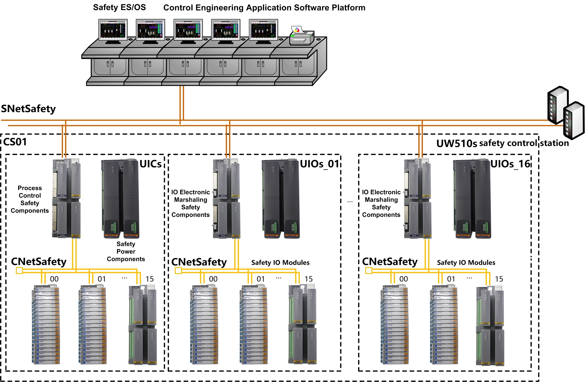 UW510s is suitable for safety-related applications in low-requirement and high-requirement modes defined by IEC61508, UW510s is suitable for FGS fire alarm and gas detection related applications as defined by EN 54-2 and NFPA 72. complies with SC3 system capability level and SIL3 hardware safety integrity level defined by IEC61508 and has passed SIL3 safety evaluation certification. The IO scale of local control station and electronic marshalling IO station:AIO:256、DIO:1024, the IO scale of system: AIO:15872、DIO:63488.
