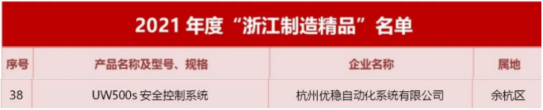 根據(jù)《關(guān)于“浙江制造精品”認定推廣和應(yīng)用的實施意見》和《關(guān)于開展2021年度“浙江制造精品”申報工作的通知》要求,經(jīng)企業(yè)申報、各地推薦、專家評審和公示,確定295個產(chǎn)品為2021年度“浙江制造精品”,其中,優(yōu)穩(wěn)公司自主研發(fā)的UW500s安全控制系統(tǒng)成功上榜。