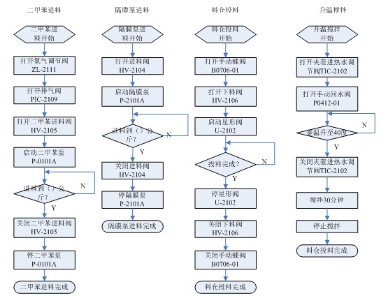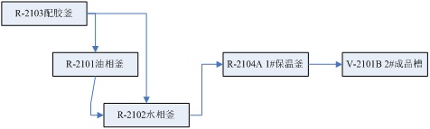 批次執(zhí)行過程中,控制站里組態(tài)好的順序控制邏輯會一步步執(zhí)行,提示操作工按照操作規(guī)程一步步操作。例如微膠囊產(chǎn)品A的控制邏輯如下: