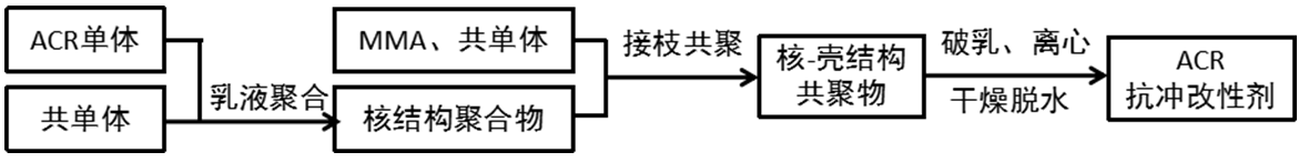 ACR是丙烯酸酯共聚物,屬于“核-殼”結(jié)構(gòu)共聚物。它的制備是以各類丙烯酸酯以及交聯(lián)劑、乳化劑、引發(fā)劑、分子量調(diào)節(jié)劑等原料,經(jīng)多次乳液聚合而制得的白色微細(xì)無(wú)毒、無(wú)腐蝕性粉末。
