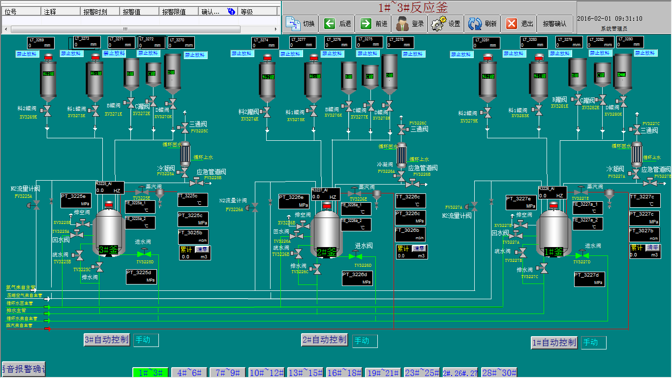 UW500集散控制系統(tǒng)在該項(xiàng)目上投運(yùn)以來(lái)的生產(chǎn)運(yùn)行表明,配方管理使整個(gè)生產(chǎn)過(guò)程變得簡(jiǎn)單易行,提高了30%的生產(chǎn)效率,并實(shí)現(xiàn)全自動(dòng)化控制,減少人為出錯(cuò),提高產(chǎn)品質(zhì)量。并通過(guò)規(guī)則控制、單回路—串級(jí)切換控制、邏輯預(yù)測(cè)串級(jí)控制、隨動(dòng)控制等多種控制方案對(duì)聚合釜的溫度進(jìn)行了控制,取得了令人滿意的結(jié)果,如恒反階段溫度波動(dòng)控制在±0.2℃,升溫速度快,升溫吸熱和聚合放熱平滑過(guò)渡等。