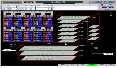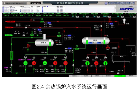奧斯麥特爐在熔煉過(guò)程中會(huì)產(chǎn)生大量高溫?zé)煔?,因此通過(guò)余熱鍋爐回收利用高溫?zé)煔庥脕?lái)產(chǎn)生蒸汽,并輸送到廠內(nèi)的發(fā)電站實(shí)現(xiàn)發(fā)電。考慮到鋅渣熔煉過(guò)程會(huì)產(chǎn)生大量煙塵以及發(fā)生爐渣噴濺粘結(jié)堵塞上升煙道的可能性,因此采用了新型的帶有膜式全水冷壁垂直上升煙道、強(qiáng)制循環(huán)和新型帶彈簧墊錘式振打清灰裝置的余熱鍋爐,每小時(shí)產(chǎn)出100 t的4.3 MPa、254℃過(guò)熱蒸氣,供廠內(nèi)發(fā)電站發(fā)電。圖2.4為現(xiàn)場(chǎng)實(shí)際的汽水系統(tǒng)運(yùn)行畫面。
