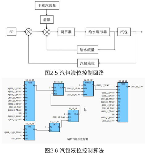 汽包液位是鍋爐安全運(yùn)行的一個(gè)十分重要的參數(shù),是自動(dòng)控制的重要環(huán)節(jié),汽包液位保持在規(guī)定范圍內(nèi)是保證鍋爐正常運(yùn)行的必要條件,本次鍋爐汽包液位采用三沖量的控制方式,可以有效避免“虛假水位”帶來(lái)的安全隱患,使汽包液位波動(dòng)小,液位控制平穩(wěn)。圖2.5為控制回路,圖2.6為控制算法。