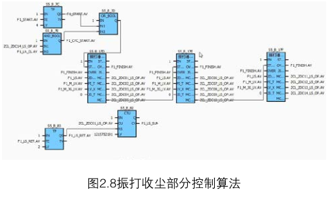 余熱鍋爐爐壁上安裝有100多個(gè)振打電機(jī),通過(guò)振打電機(jī)將粘附在爐壁上的煙塵(含氧化物產(chǎn)品)進(jìn)行收集。設(shè)計(jì)的振打控制系統(tǒng)可實(shí)現(xiàn)單周期、連續(xù)振打的振打方式,層與層、每個(gè)振打電機(jī)的間隔時(shí)間,振打電機(jī)的振打運(yùn)行時(shí)間均可靈活調(diào)整,方便適應(yīng)現(xiàn)場(chǎng)各種控制要求。如圖2.8為現(xiàn)場(chǎng)部分的控制算法。