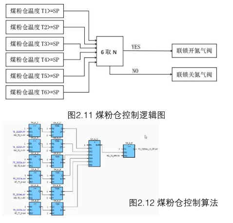 煤粉制備的過(guò)程中,控制各個(gè)環(huán)節(jié)的煤粉溫度是十分重要的,煤粉在高過(guò)一定溫度在含氧情況下容易發(fā)生燃燒、爆炸。所以在煤粉倉(cāng)溫度到達(dá)一定溫度時(shí)需要往煤粉倉(cāng)內(nèi)充入氮?dú)膺M(jìn)行降溫。本次控制通過(guò)選取煤粉倉(cāng)中的幾個(gè)溫度高于一定值(設(shè)定值可變)聯(lián)鎖打開氮?dú)忾y。圖2.11為控制邏輯圖,圖2.12為控制算法。