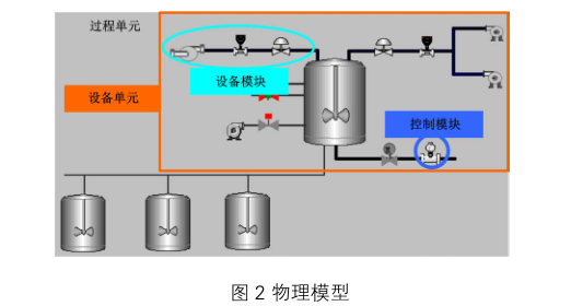 物理模型用來描述批量生產(chǎn)中的設(shè)備,分為過程單元(process cell)、設(shè)備單元(unit)、設(shè)備模塊(equipmentmodule)和控制模塊(control module)四層。其中,控制模塊由一組傳感器、激勵(lì)裝置和其他控制模塊組成,完成一個(gè)基本的控制活動(dòng);設(shè)備模塊由完成一個(gè)簡單任務(wù)的某些控制模塊組成;設(shè)備單元由生產(chǎn)過程中完成某一特定任務(wù)的設(shè)備模塊和控制模塊構(gòu)成;過程單元?jiǎng)t包括批量生產(chǎn)中所有的生產(chǎn)操作設(shè)備和輔助操作設(shè)備。物理模型如圖2 所示: