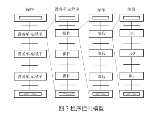 在批量生產(chǎn)中,產(chǎn)品的加工是按配方規(guī)定的順序及操作參數(shù)進(jìn)行的。配方由批量執(zhí)行機(jī)構(gòu)實(shí)時(shí)執(zhí)行,它包含某一特定批量生產(chǎn)中與產(chǎn)品相關(guān)的所有信息,包括產(chǎn)品的原料配比和產(chǎn)品生產(chǎn)的工藝信息。配方由標(biāo)題、公式、設(shè)備要求、程序及附加信息組成。其中程序是配方中最重要的一部分,根據(jù) ISA S88 中的程序控制模型,配方中的程序由上至下分為程序(program)、設(shè)備單元程序(unitprogram)、操作(operation)和階段(phase)四個(gè)層次。其中,階段是程序控制模型中最基本的構(gòu)件,它包括對(duì)元器件的離散控制、調(diào)節(jié)回路和聯(lián)鎖保護(hù)。選擇和組合階段,構(gòu)成在一個(gè)設(shè)備單元內(nèi)進(jìn)行產(chǎn)品批量生產(chǎn)的單元操作,它定義了一個(gè)主要的、能夠使被加工的物料發(fā)生化學(xué)或物理變化的加工順序。進(jìn)一步組合單元操作就構(gòu)成了單元程序。最后,由設(shè)備單元程序按照規(guī)定的操作順序來完成整個(gè)批量生產(chǎn)的程序。程序控制模型如圖 3 所示: