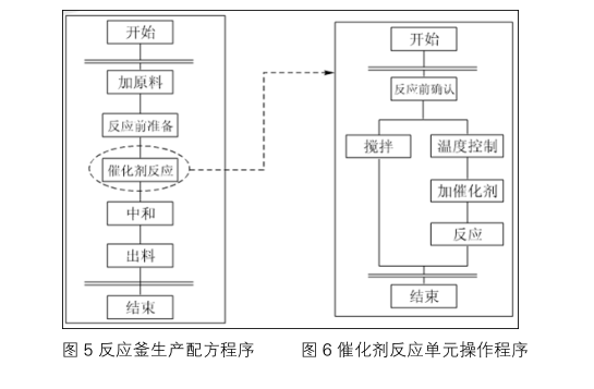 在生產(chǎn)、操作周期,通過批生產(chǎn)控制中心(BatchControl Center)來實(shí)現(xiàn)配方的運(yùn)行、管理以及修改。比如生產(chǎn) 1# 牌號(hào)產(chǎn)品,該程序便啟動(dòng)主配方(MasterRecipe)庫中 1# 牌號(hào)對(duì)應(yīng)的配方,將配方公式和參數(shù)加載到圖 5 所示的配方程序中,程序啟動(dòng)并運(yùn)行至階段層時(shí),相應(yīng)的控制模塊和設(shè)備模塊會(huì)按照之前的配方參數(shù),控制表 1 中設(shè)備單元中相關(guān)的設(shè)備,從而實(shí)現(xiàn)該批次的批量生產(chǎn),也就是完成了一次控制配方(Control Recipe)的執(zhí)行。圖 6 為與圖 5 配方程序中“催化劑反應(yīng)”單元操作相對(duì)應(yīng)的程序功能圖,該程序通過對(duì)控制器中攪拌、反應(yīng)等設(shè)備階段的調(diào)用,來完成指定的單元操作。