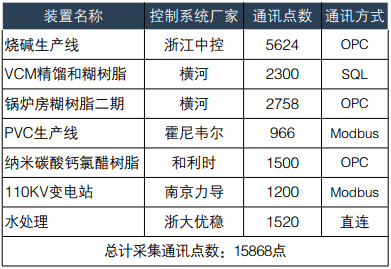 本項目為某化工集團(tuán)公司集成信息平臺建設(shè)項目,目前該公司有10萬噸/年燒堿、10萬噸/年聚氯乙烯、20萬噸/年電石、7噸/年糊樹脂、2萬噸/年氯醋樹脂、10萬噸/年CPVC、6萬噸/年納米碳酸鈣等生產(chǎn)線,由于建設(shè)時期不同,先后采用了不同品牌的自控系統(tǒng),導(dǎo)致數(shù)據(jù)無法共享,影響生產(chǎn)效率。為解決這個難題,優(yōu)穩(wěn)公司為其搭建全集成信息平臺,將各個異構(gòu)的工業(yè)控制系統(tǒng)進(jìn)行整合,實現(xiàn)信息共享,全局一致。目前本項目使用的各控制系統(tǒng)如表所示: