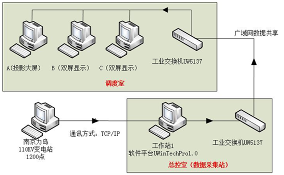工作站搭載優(yōu)穩(wěn)UWinTech軟件,通過TCP/IP協(xié)議在軟件上讀取南京力導(dǎo)系統(tǒng)數(shù)據(jù),在通過優(yōu)穩(wěn)內(nèi)部廣域網(wǎng)將數(shù)據(jù)共享至調(diào)度室的工程師站。從成本考慮,一臺工作站帶有三個網(wǎng)卡,可以與兩套設(shè)備通訊。