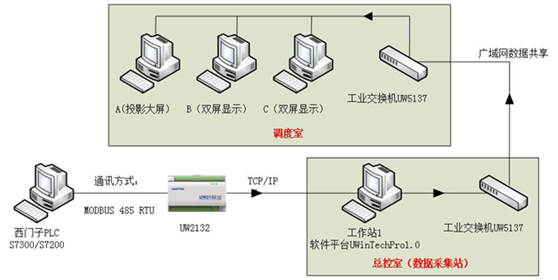 每套系統(tǒng)都有對應(yīng)的工程師站,將每套系統(tǒng)的工程師站連接到UWNTEK的任一工作站,工作站搭載優(yōu)穩(wěn)UWinTech軟件,作為一個網(wǎng)關(guān)設(shè)備,再通過優(yōu)穩(wěn)內(nèi)部網(wǎng)絡(luò)共享至調(diào)度室的工作站。這樣設(shè)計可以讓設(shè)備一對一,使工程設(shè)計簡單化,并且使用同樣的軟件作為網(wǎng)關(guān)設(shè)備,后期易維護(hù)。